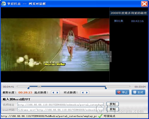 拖動進(jìn)度條左右的打點(diǎn)按鈕可以設(shè)定片段的開始和結(jié)束時間點(diǎn),還可以點(diǎn)擊起點(diǎn)微調(diào)和重點(diǎn)微調(diào)的左右箭頭對截取的視頻進(jìn)行微調(diào),然后點(diǎn)擊“生成”,再點(diǎn)擊“復(fù)制”可以將截取的節(jié)目URL粘貼到WORD、PPT、BBS或BLOG等頁面中。