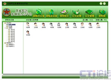 如圖所示的畫面即為網(wǎng)動協(xié)同辦公系統(tǒng)的基礎(chǔ)工具——協(xié)同通訊系統(tǒng),該系統(tǒng)可將部隊機(jī)構(gòu)內(nèi)的所有部門、人員按照實(shí)際的組織結(jié)構(gòu)列出,應(yīng)用該系統(tǒng)的人員通過點(diǎn)擊其他在線人員,從而有選擇性的與對方進(jìn)行語音、視頻、數(shù)據(jù)共享、點(diǎn)對點(diǎn)會議等各種操作,將以往“看不見”的對話變?yōu)椤懊鎸γ妗钡慕涣。相比于傳統(tǒng)的電話溝通而言,它不僅更暢通快捷,更可以最大化的降低溝通成本。另外,數(shù)據(jù)共享功能還可以將軍隊里需共同探討的話題,如作戰(zhàn)地圖動態(tài)研究、工作報告資料等實(shí)時顯示在數(shù)據(jù)區(qū)中,雙方通過電腦即可進(jìn)行遠(yuǎn)程的話題討論、圈點(diǎn)批注。