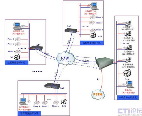 本次項(xiàng)目中,融天科技為大連市政府部署的防火調(diào)度指揮系統(tǒng)涉及點(diǎn)包括市政府中心調(diào)度室和分布在大連市各轄區(qū)的9個遠(yuǎn)程指揮小組,中心調(diào)度室通過RT-CCP1000一體化調(diào)度平臺部署10個中心調(diào)度值班員,轄區(qū)的9個遠(yuǎn)程指揮小組通過大容量IAD設(shè)備和政府VPN專網(wǎng)遠(yuǎn)程注冊到中心調(diào)度室RT-CCP1000平臺上,同時RT-CCP1000平臺與本地的PSTN通過一條數(shù)字中繼E1連接,作為系統(tǒng)的出入口。如下圖所示: