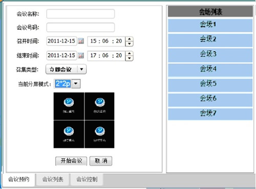 在調(diào)度臺(tái)界面主界面,點(diǎn)擊“視頻會(huì)議”按鈕,在終端區(qū)選擇會(huì)場(chǎng),再次點(diǎn)擊“視頻會(huì)議”按鈕,界面切換到會(huì)議設(shè)置界面,進(jìn)行相應(yīng)的設(shè)置,點(diǎn)擊“開始會(huì)議”按鈕即可。