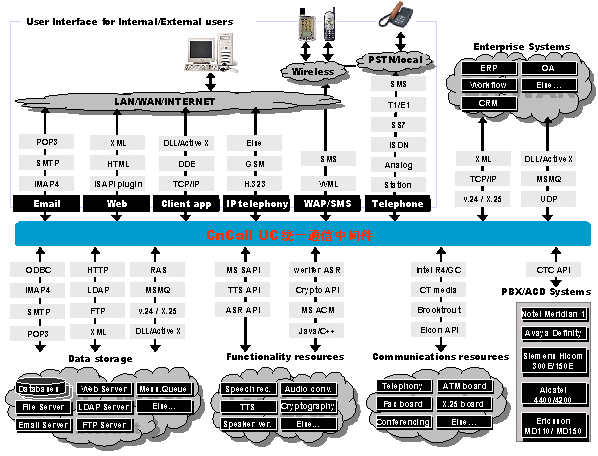 UC統(tǒng)一通信平臺(tái)是通信開(kāi)發(fā)平臺(tái)的世界領(lǐng)先者, 提供功能強(qiáng)大而又迅速的開(kāi)發(fā)技術(shù)來(lái)建立復(fù)雜的企業(yè)通信服務(wù)。這些技術(shù)包括CTI,傳真,數(shù)據(jù)通信,電子郵件,VXML, HTML,ASR,TTS, WAP,數(shù)據(jù)庫(kù)接入等。標(biāo)準(zhǔn)接口讓我們方便的與企業(yè)CRM、ERP、OA等系統(tǒng)連接。
