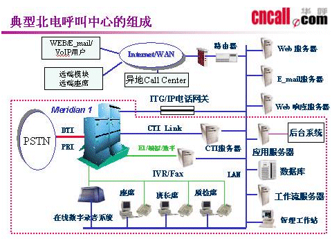 本方案使用北電Meridian 1 Option 11C交換機、配備計算機電話集成系統(tǒng)(CTI link 中間件)、交互式語音/傳真應答系統(tǒng)(IVR/FAX)、智能路由和呼叫處理系統(tǒng)(SmartRouting)、人工座席系統(tǒng)(SmartAgent)、呼叫中心管理系統(tǒng)(CCM)、錄音監(jiān)控系統(tǒng)(CClog)、數(shù)據(jù)庫服務器、應用服務器、網絡系統(tǒng)等,通過應用網關與現(xiàn)有的業(yè)務應用系統(tǒng)集成。