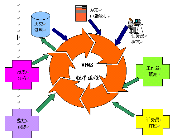 如上面所描述的WFMS流程,最初開始于歷史的電話信息、目前的ACD數(shù)據(jù)和服務(wù)代表的簡(jiǎn)介。從這些綜合的信息,做出對(duì)工作量的預(yù)測(cè),從而從本質(zhì)上決定了配備給呼叫中心的服務(wù)代表數(shù)量。了解了服務(wù)代表的需求數(shù)量,一個(gè)適用于任何時(shí)間段的工作時(shí)間表就可以產(chǎn)生了,包括每天的,每周的,每月的;谶@一點(diǎn),主管人就可以監(jiān)控服務(wù)代表的行為,追蹤來電,并分析不同種類的來電分組,做出應(yīng)對(duì)假定情景的方案,從而產(chǎn)生各種各樣的報(bào)告和圖表。