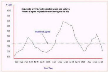 Inbound的來話量成不規(guī)則的波形圖,形成這種不規(guī)則波形圖中波峰和波谷的原因是在這些波峰和波谷工作的員工數量。(見圖8.來話量的分布圖)這將對在一天中的每個時段能夠分配最理想的員工來工作造成了最大的困難。一個小時能可能從來話量的波峰到達波谷,管理人員如何排班來匹配話務量對人員的要求,這是很多人的困惑。下圖描繪了某個呼叫中心8小時來話量分布情況。