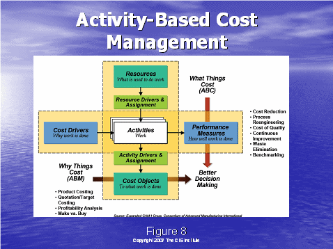 通過了解圖8,我們將以行動(dòng)成本管理大體是什么的總括作為結(jié)束。我們從左邊的成本驅(qū)動(dòng)因素開始——這是做工作的原因,例如:獲得客戶,維持客戶。就如圖4中所說的,這些成本驅(qū)動(dòng)因素可以細(xì)分到工作行動(dòng)上去?梢酝ㄟ^描述人,培訓(xùn),設(shè)備和技術(shù)資源來組成工作行動(dòng)。資源驅(qū)動(dòng)因素被用于分配這些企業(yè)成本到各個(gè)行動(dòng)上去。下一步就是系統(tǒng)地確定行動(dòng)驅(qū)動(dòng)因素,分配行動(dòng)成本到成本對(duì)象上去,這有利于決策的制定。例如,獲得一個(gè)客戶和維持一個(gè)客戶需要花費(fèi)多少的成本?