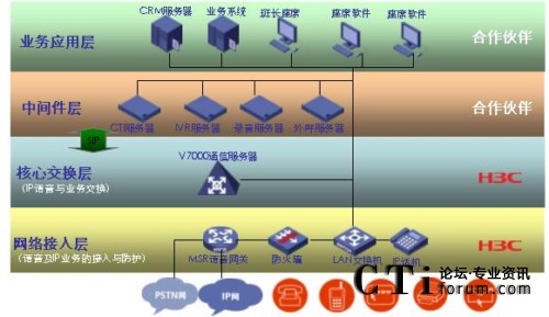 H3C公司采用標(biāo)準(zhǔn)的IP語音SIP協(xié)議,基于VCX純IP語音通信平臺(tái),與合作伙伴產(chǎn)品集成,為客戶提供新一代純IP呼叫中心解決方案;诩僆P的語音通信平臺(tái),客戶可以快速實(shí)現(xiàn)呼叫中心系統(tǒng)的部署,并且方便實(shí)現(xiàn)遠(yuǎn)程坐席、虛擬坐席的實(shí)施方案;實(shí)現(xiàn)多種媒體通信方式,如采用郵件、傳真、即時(shí)通信、WEB等方式快速建立客戶和企業(yè)之間的溝通橋梁,提高呼叫中心坐席處理客戶業(yè)務(wù)的效率;更重要的是,基于SIP協(xié)議優(yōu)秀的開放特性,IP呼叫中心能夠快速實(shí)現(xiàn)同各種語音增值應(yīng)用的集成,更好的將IP語音通信技術(shù)應(yīng)用到呼叫中心的系統(tǒng)服務(wù)中來。