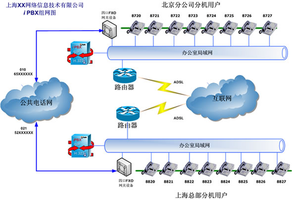 該公司于2005年4月先后購買了兩套eTalk iPBX系統(tǒng),分別安裝于上?偛亢捅本┓止。并利用現(xiàn)有辦公室內(nèi)部網(wǎng)絡(luò)布設(shè)分機(jī)。