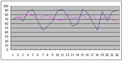 這是兩個呼叫中心從早上8點開始,一直到晚上6點,每隔半個小時的服務(wù)水平?梢院芮宄目吹,藍色這條線,它服務(wù)水平在91到48這中間震蕩,平均服務(wù)水平是73左右,粉紅色這條線,雖然平均服務(wù)水平也是在73左右,但震蕩幅度卻小了很多,服務(wù)水平只在81到68這中間震蕩。