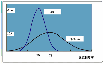 我們先看小組一,小組一的平均通話利用率是59,有20人達到了59這個通話利用率(請看縱軸的20人這刻度),剩下一半的人比59這平均數(shù)高,另外一半的人比59這平均數(shù)低。