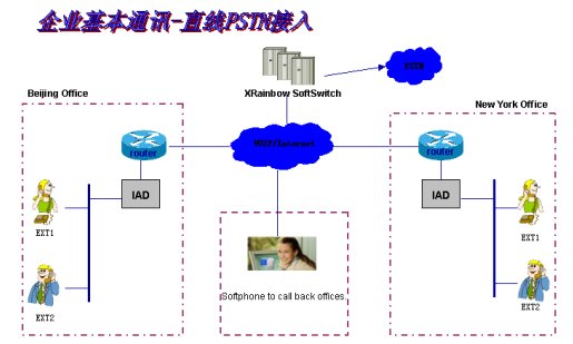 此方案主要適用于采用直線PSTN接入的企業(yè)用戶,有些小型企業(yè)由于公司處于建立初期或員工人數(shù)較少,所以沒有接入傳統(tǒng)的小型交換機,而是直接使用直線電話線路接入。這樣的企業(yè)一般都迫切需要降低公司成本,提高客戶服務(wù)質(zhì)量,來提高公司的客戶形象。我們針對小型企業(yè)前期投資小的特點,推薦企業(yè)前期使用IAD設(shè)備來解決企業(yè)話務(wù)問題。小型企業(yè)分支機構(gòu)少,企業(yè)內(nèi)部通訊需求小,主要話務(wù)需求在撥打國內(nèi)國際長途業(yè)務(wù)上。采用IAD設(shè)備既節(jié)省了費用,也達到了企業(yè)發(fā)展的需求。彩虹電信還有自己開發(fā)的軟終端,在家里或移動辦公時可以方便使用。