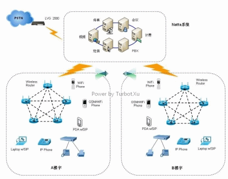 如果當(dāng)整個(gè)樓宇被WiFi網(wǎng)絡(luò)覆蓋,用戶可通過WiFi Phone或支持WiFi功能的PDA手機(jī)注冊到Netta交換系統(tǒng),如使用有線網(wǎng)絡(luò),用戶可通過Gateway