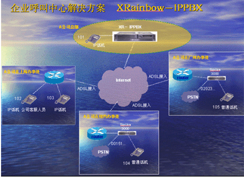 IPPBX將成為企業(yè)辦公不可缺少的一部分。此方案適合于已經(jīng)有PBX的公司,由于先期已經(jīng)投入了PBX設(shè)備,費(fèi)用昂貴,所以不會輕易被替換。在外地有多家分公司,使用傳統(tǒng)電話通訊費(fèi)用很高,希望能降低成本。并希望在分公司所在城市可以通過當(dāng)?shù)氐腜STN落地,節(jié)省長途費(fèi)用。依照客戶的需求,我們制定了以下方案: