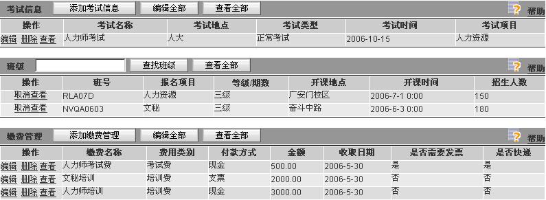 點(diǎn)擊單個學(xué)員查看頁面的相關(guān)列表,直接添加其他考務(wù)信息。張小玲是報名人力資源三級和文秘三級的學(xué)員,人力三級學(xué)習(xí)需要代辦考試。繳納人力培訓(xùn)費(fèi)3000元,文秘培訓(xùn)2000元,報名人力資源管理師考試費(fèi)500元。