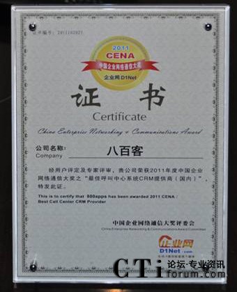 CTI論壇(ctiforum)10月31日消息(記者 張潔):10月19日,2011 秋季CENCE 中國企業(yè)網(wǎng)絡(luò)通信大會暨云計(jì)算高峰論壇在上海展覽中心盛大舉行。國內(nèi)首家SaaS廠商八百客憑借連續(xù)在云計(jì)算領(lǐng)域的成熟技術(shù)以及在市場中的廣泛認(rèn)可度,獲得“最佳呼叫中心系統(tǒng)CRM提供商”大獎(jiǎng)。