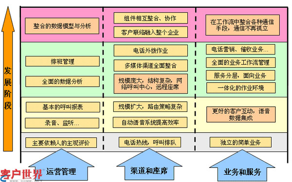 如圖一所示,國內大多數企業(yè)呼叫中心基本經歷了三個階段的發(fā)展,在呼叫中心建設初期,往往只是建設成電話熱線,座席人員接通電話,通過與客戶交流,利用簡單獨立的呼叫中心應用系統(tǒng),完成咨詢和接受訂單工作,在這階段對呼叫中心來講基本沒有什么管理,主要靠人的主觀評價來實現(xiàn)粗放運營。