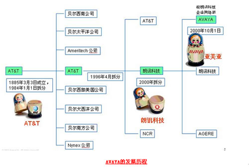 Avaya的歷史最早可以追溯到1885年成立的美國(guó)電話電報(bào)公司(AT&T),AT&T在1994年一分為AT&T、朗訊科技、NCR等三家公司,而Avaya于2000年10月從朗訊科技的企業(yè)通信部門剝離獨(dú)立上市(代碼AV),再后來即上文中提到的Avaya被兩大私募德州太平洋集團(tuán)和銀湖合伙組成的財(cái)團(tuán)用82億美元私有化。