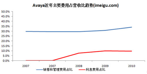 Avaya的成本和費(fèi)用主要由營(yíng)業(yè)成本、銷售和管理費(fèi)用、研發(fā)費(fèi)用、無形資產(chǎn)攤銷費(fèi)用、利息支出等構(gòu)成。(1)營(yíng)業(yè)成本主要由硬件費(fèi)用、第三方合作伙伴授權(quán)費(fèi)用以及相關(guān)產(chǎn)品和服務(wù)的人力成本組成,2010財(cái)年?duì)I業(yè)成本占營(yíng)收比為57.1%;(2)銷售和管理費(fèi)用定義為銷售和市場(chǎng)活動(dòng)以及管理活動(dòng)相關(guān)的工資薪酬、設(shè)備折舊費(fèi)用等等,2010財(cái)年該項(xiàng)費(fèi)用占比達(dá)30.4%;(3)無形資產(chǎn)攤銷主要來自分期攤銷并購(gòu)NES 時(shí)的客戶關(guān)系價(jià)值,2010財(cái)年占營(yíng)收比4.3%。(4)利息費(fèi)用即相關(guān)債務(wù)的利息支出和規(guī)避利率風(fēng)險(xiǎn)敞口的金融工具費(fèi)用,2010財(cái)年占營(yíng)收達(dá)9.6%。