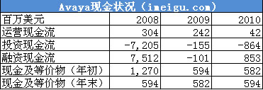 2008、2009、2010財(cái)年Avaya公司運(yùn)營(yíng)現(xiàn)金流分別為3.04億美元、2.42億美元、4200萬美元,2010財(cái)年運(yùn)營(yíng)現(xiàn)金流急劇減少因并購(gòu)北電的企業(yè)通信部門(NES)影像所致,截至2010財(cái)年(即2010年9月30日)Avaya公司現(xiàn)金及等價(jià)物為5.94億美元。