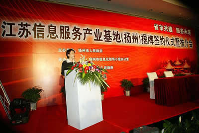 “腰纏十萬貫,騎鶴下?lián)P州”——在“煙花三月”最美的季節(jié),在“長(zhǎng)江三角洲經(jīng)濟(jì)帶”最具活力的地區(qū),在榮獲“聯(lián)合國(guó)人居獎(jiǎng)”的揚(yáng)州,4月21、22日“江蘇信息服務(wù)產(chǎn)業(yè)基地(揚(yáng)州)揭牌簽約推介暨揚(yáng)州呼叫產(chǎn)業(yè)基地建設(shè)運(yùn)營(yíng)管理論壇”隆重舉行,揚(yáng)州市市長(zhǎng)、江蘇省信息產(chǎn)業(yè)廳廳長(zhǎng)、揚(yáng)州人大等四套班子以及來自北京、上海及江蘇省內(nèi)的各信息產(chǎn)業(yè)的相關(guān)企業(yè)高管及業(yè)內(nèi)知名專家,帶著投資,帶著知識(shí),帶著對(duì)信息揚(yáng)州規(guī)劃的建議,齊聚揚(yáng)州,共商大計(jì)。