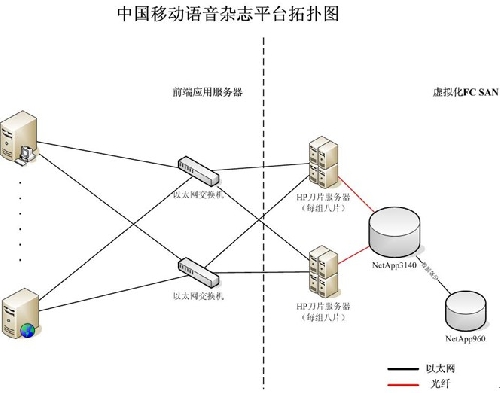 其中,NetApp FAS3140 配有 6 個(gè) 450GB 的 FC 磁盤和兩個(gè) 300GB FC 磁盤,裸容量為 46TB,用于運(yùn)行中國(guó)移動(dòng)的語音雜志業(yè)務(wù),采用 Socket 連接。NetApp FAS2050 則內(nèi)置有 12 塊1TB SATA 磁盤,裸容量為 12TB,主要用于測(cè)試高陽公司 Oracle 數(shù)據(jù)庫和網(wǎng)站應(yīng)用等。
