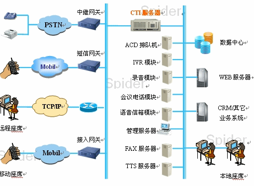 隨著呼叫中心相關(guān)技術(shù)的發(fā)展,呼叫中心的功能日益豐富,其組成結(jié)構(gòu)也日益復(fù)雜。一個(gè)完整的呼叫中心可以認(rèn)為由基本部分和擴(kuò)展部分兩部分組成。呼叫中心的基本組成部分為:自動(dòng)呼叫分配模塊(ACD)、IVR交互式語音應(yīng)答系統(tǒng)、CTI服務(wù)器、錄音、人工座席、班長席、后臺(tái)管理系統(tǒng)等;擴(kuò)展模塊包括FAX服務(wù)器、web服務(wù)器、email服務(wù)器及語音信箱、會(huì)議電話等功能。