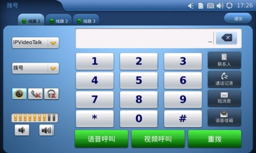 7寸大屏搭配寬大的數(shù)字虛擬鍵盤,讓你的撥號準(zhǔn)確無誤。同時界面的所顯示的通話功能諸如查找聯(lián)系人、查找通話記錄、發(fā)送短消息或者快速進(jìn)入語音信箱等功能也清晰明了?梢园l(fā)現(xiàn)的是,用戶在輸完號碼之后可自主選擇采用語音呼叫還是視頻呼叫。另外,同潮流網(wǎng)絡(luò)之前的一款視頻電話GXV3140一樣的是,GXV3175也在出廠自帶了一個IPVideoTalk賬號。該賬號是出廠時就已配置好的,每一臺電話配備一個號碼并顯示在桌面上。也就是說,用戶在拿到GXV3175并聯(lián)網(wǎng)之后即可使用該賬號撥打免費的視頻電話了。這可是很多廠商所沒有的特殊功能。下面我們就使用隨機附送的IPVideoTalk賬號來撥打視頻電話。