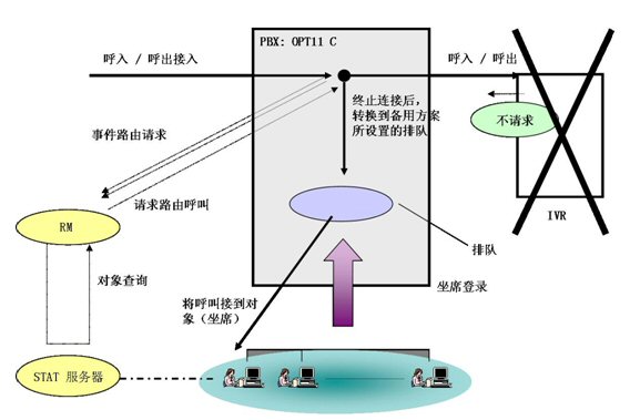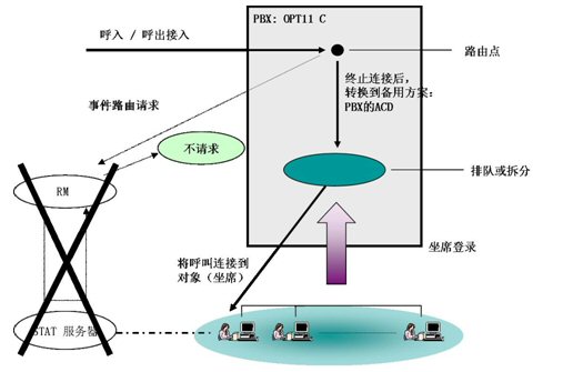 - 當RM出現(xiàn)故障(包括Server物理損壞、RM程序意外終止、網(wǎng)絡(luò)連接失效)時,RM將對電話的控制權(quán)交還給PBX,PBX根據(jù)自己的電話分配規(guī)則將電話分配到坐席。