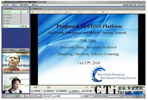 視維視頻會議系統(tǒng)良好的兼容性,使亞太地區(qū)各成員國的代表雖遠(yuǎn)隔千山萬水,依然可以實現(xiàn)無限溝通。視維視頻會議系統(tǒng)所提供的清晰流暢的音視頻使各成員國的代表無需走出國門,無需聚到一起,就可以輕松地網(wǎng)絡(luò)面對面的進(jìn)行交流,既可節(jié)約差旅費用,又可避免舟車勞頓之苦,是各國代表有更多精力投入到工作中;視維的共享白板、共享文檔、文件下載等強(qiáng)大的數(shù)據(jù)協(xié)作功能可以使各國代表快速地共享更多的信息、資料,及時地開展越洋培訓(xùn)。近日網(wǎng)絡(luò)面對面地討論第三屆APEDNN的進(jìn)程及各項議題就是一次典型的應(yīng)用之一,不僅節(jié)約了差旅和時間成本,而且提高了工作效率,拉近世衛(wèi)各成員國之間的距離,天涯若比鄰,是各國代表在工作上更為默契,提高人類應(yīng)對突發(fā)事件與災(zāi)害的能力。