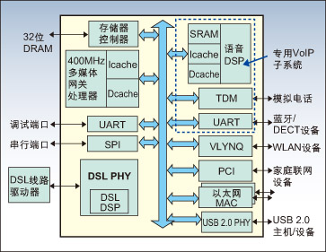圖2演示了這種架構的一個例子,即一款帶集成ADSL和VDSL2寬帶連接功能的SoC。該SoC具有一個工作在400MHz頻率的多媒體網(wǎng)關處理器,性能比以前產(chǎn)品提升了一倍。附加的硬件加速器和32位寬的存儲器接口進一步提升了該網(wǎng)關的聯(lián)網(wǎng)能力。