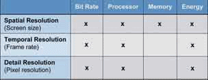 盡管移動視頻設(shè)備的處理能力一代比一代強大,但用手持設(shè)備捕獲的HD或SD視頻全都需要處理,這樣才能被網(wǎng)絡(luò)服務(wù)器上的終端設(shè)備播放。表1給出了不同視頻編碼參數(shù)對解碼設(shè)備所需資源選擇的大致影響。該表專門對采用運動補償與離散余弦變換(DCT)技術(shù)實現(xiàn)視頻壓縮的基于塊的視頻編解碼器進行了分析。
