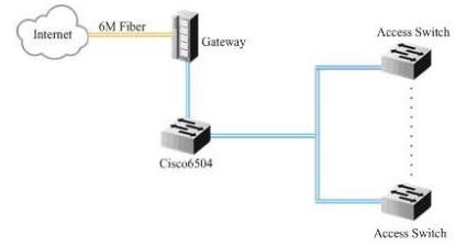 客房局域網(wǎng)通過一條6M的光纖接入CNC網(wǎng)絡(luò),網(wǎng)關(guān)設(shè)備承擔(dān)了DHCP、NAT和流量限制等功能,同時在思科6504上安裝有安全板卡,對內(nèi)部網(wǎng)絡(luò)安全進(jìn)行加強(qiáng)和防御。由于每個客房有2~3個信息點,客房局域網(wǎng)總共有1300個左右的信息點。