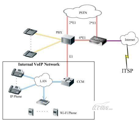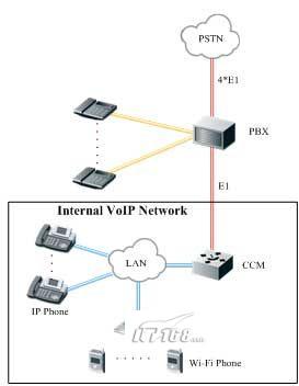 酒店申請了4條到CNC的E1線路,用于語音呼叫業(yè)務,同時內(nèi)部還建設有覆蓋整個酒店的VoIP網(wǎng)絡,通過CCM系統(tǒng)進行集中管理,CCM系統(tǒng)與PBX之間通過E1線進行連接。