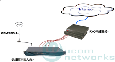 本方案采用FXO中繼語(yǔ)音網(wǎng)關(guān)接入互聯(lián)網(wǎng),由當(dāng)?shù)仄胀M電話線路落地對(duì)接網(wǎng)關(guān)FXO口,采用電話卡綁定網(wǎng)關(guān)預(yù)付費(fèi)計(jì)費(fèi)實(shí)現(xiàn)運(yùn)營(yíng)。落地線路接入可以使用本地固定PSTN線路,也可以轉(zhuǎn)制無線電話,采用固定臺(tái)接入,2種拓?fù)鋱D如下所示。