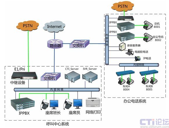 化。在總部核心機(jī)房將電話外線中繼接口與中繼網(wǎng)關(guān)設(shè)備連接,并通過內(nèi)部網(wǎng)絡(luò)對(duì)接到IPPBX,分別應(yīng)用于辦公電話系統(tǒng)和公司呼叫中心系統(tǒng)。設(shè)備用于公司辦公電話和公司會(huì)議系統(tǒng),可最大支持到30方會(huì)議,或多個(gè)小型獨(dú)立會(huì)議系統(tǒng)。各個(gè)不同的車間可以采用電話線之間接入分機(jī),或采用傲威AVG800的網(wǎng)關(guān)通過網(wǎng)絡(luò)接入,并注冊(cè)到IPPBX系統(tǒng)實(shí)現(xiàn)內(nèi)網(wǎng)網(wǎng)絡(luò)分機(jī)。對(duì)將來的分公司的辦公電話系統(tǒng),將不再使用傳統(tǒng)的PBX設(shè)備,而是直接利用IPPBX系統(tǒng),通過IP