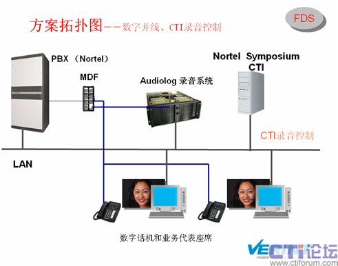 Audiolog錄音系統(tǒng)能和Nortel交換機(jī)、Symposium CTI進(jìn)行整合,并從中拿到錄音檢索參數(shù),便于用戶(hù)檢索。