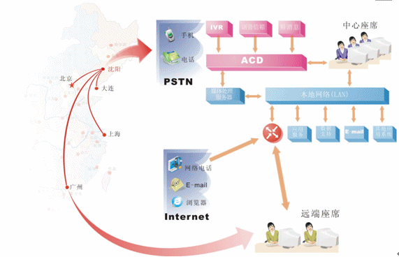 對于地區(qū)分布廣泛,而又要集中管理的企業(yè),可在各個局部地區(qū)設(shè)置遠(yuǎn)端座席,并通過網(wǎng)絡(luò)方便的接入中心系統(tǒng)。我們?yōu)檫h(yuǎn)端座席提供與中心座席完全相同的操作,遠(yuǎn)端座席可以根據(jù)各個地區(qū)的特定情況有針對性的處理各個局部地區(qū)的業(yè)務(wù),為中心分流壓力,同時中心系統(tǒng)也可以完全掌握遠(yuǎn)端座席的情況。我們可以非常明確的一點(diǎn)是:采用分布式座席的技術(shù),使得遠(yuǎn)端座席與中心座席除了地域上的差異,其它部分完全相同。可以說只要網(wǎng)絡(luò)無極限,座席分布就是無極限的。