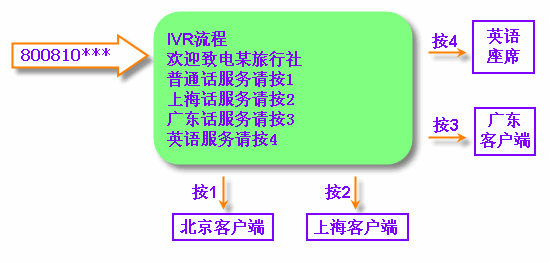 當(dāng)客戶撥打電話進(jìn)入MVB2000系統(tǒng)平臺(tái)的呼叫中心。通過(guò)IVR導(dǎo)航,可隨意打到各地的客戶端,再通過(guò)客戶端進(jìn)行更加細(xì)致的分類。并且,每個(gè)客戶端都可以互相轉(zhuǎn)接。IVR流程可以無(wú)限下拉菜單。