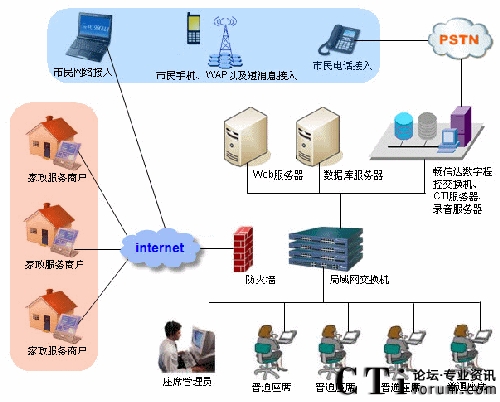 隨著國內(nèi)城市化地不斷加快,人口老齡化的加劇,人民群眾對家政服務(wù)需求也越來越旺盛,家政服務(wù)業(yè)的重要性也日益凸顯。為了規(guī)范家政服務(wù)市場、整合家政市場資源、培育家政服務(wù)示范性企業(yè),國家商務(wù)部、財務(wù)部于2009年4月下發(fā)了《關(guān)于推進(jìn)家政服務(wù)網(wǎng)絡(luò)體系建設(shè)的通知》的149號文件,啟動了家政服務(wù)網(wǎng)絡(luò)中心體系建設(shè)的項目,并提出了具體的規(guī)范和要求。以此為起點,為更好地服務(wù)社會滿足人民群眾日益增長的生活需求而努力。自文件下發(fā)以來,我公司就組織專門的項目組,對家政服務(wù)行業(yè)具體業(yè)務(wù)需求的調(diào)研以及開發(fā)工作。公司利用多年的開發(fā)經(jīng)驗,經(jīng)過幾個月的努力,終于在8月份完成了暢信達(dá)家政服務(wù)網(wǎng)絡(luò)中心的全套建設(shè)方案。與其它系統(tǒng)固化的功能設(shè)計不同,該方案可以靈活地定制業(yè)務(wù)模塊,方便各地的家政公司根據(jù)本市的情況和需求,確定適合自身的業(yè)務(wù)流程。系統(tǒng)業(yè)務(wù)模塊完整地覆蓋了家政服務(wù)的業(yè)務(wù)范圍與重點。并將家政服務(wù)的業(yè)務(wù)分為營業(yè)系統(tǒng)、賬務(wù)系統(tǒng)、后臺系統(tǒng)等部分,貫穿了市民從訴求提交、工單派發(fā)、工單處理、財務(wù)結(jié)算到回訪反饋的各個方面。系統(tǒng)還提供了完善的報表模塊準(zhǔn)確反映業(yè)務(wù)和系統(tǒng)運營狀況,有力地支持對平臺進(jìn)行運營管理工作。另外在方案設(shè)計上,除了滿足業(yè)務(wù)處理需要外,還充分考慮到系統(tǒng)的適應(yīng)性、穩(wěn)定性和處理的能力。首先為了滿足各地市對家政平臺的不同需求,公司專門推出了基于IBM服務(wù)器的和暢信達(dá)標(biāo)配服務(wù)器的兩種建設(shè)方案。暢信達(dá)標(biāo)配服務(wù)器方案可提供最低4模擬外線最多1條數(shù)字中繼(E1)接入,適用于初期規(guī)模較小且投資規(guī)模不大的客戶。而基于IBM服務(wù)器的方案,則主要是滿足業(yè)務(wù)量較大,同時對設(shè)備配置要求高的城市,以數(shù)字線接入為主。多種建設(shè)模式充分體現(xiàn)了方案的靈活性、可擴(kuò)展性的特征,有效地減少了運營風(fēng)險,提升了個性化定制化服務(wù)的水平。其次,根據(jù)家政市場需求預(yù)測以及已開通家政服務(wù)網(wǎng)絡(luò)中心城市的實際運營情況,一個中型城市,預(yù)計電話開通之后,話務(wù)量平均每天近3000個,這就要求系統(tǒng)不但有穩(wěn)定的性能而且要有強大的處理能力。我公司從系統(tǒng)平臺構(gòu)建、業(yè)務(wù)流程設(shè)計、設(shè)備性能、組網(wǎng)設(shè)計等方面著手,為系統(tǒng)提供了足以確保安全穩(wěn)定運行的支持。