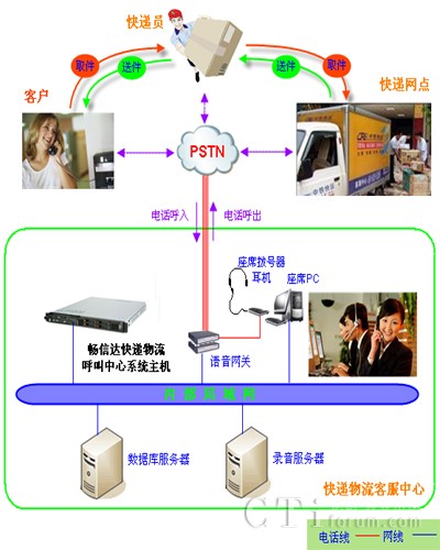 暢信達快遞物流呼叫中心系統(tǒng)是以暢信達快遞物流呼叫中心系統(tǒng)主機為呼叫交換和業(yè)務(wù)受理平臺,選配數(shù)據(jù)庫服務(wù)器和錄音服務(wù)器,采用人工座席接聽來電與發(fā)起呼叫,系統(tǒng)架構(gòu)圖如下: