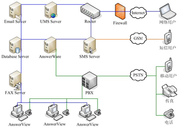 AnswerWare系統(tǒng)包括服務端控制程序、UMS(統(tǒng)一消息服務)平臺、DialWare和客戶端程序AnswerView。