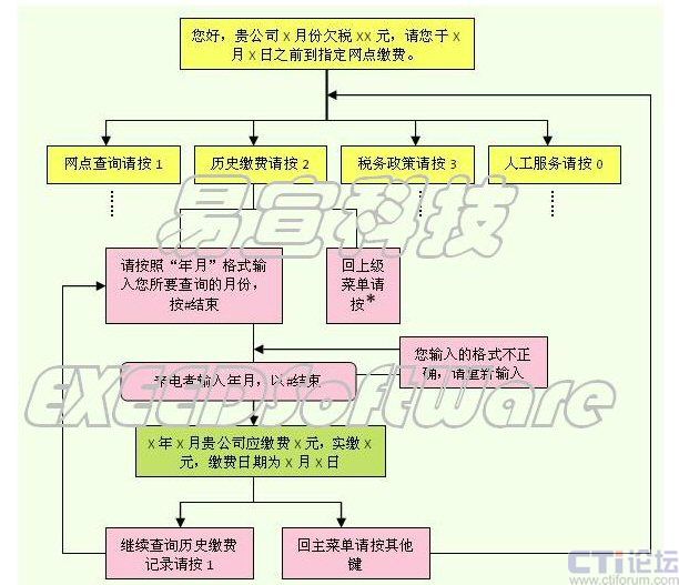 - 播放內(nèi)容為IVR交互式語(yǔ)音流程(也叫語(yǔ)音架構(gòu)),用戶和稅務(wù)部門(mén)能夠通過(guò)用戶的選擇產(chǎn)生互動(dòng)交流;