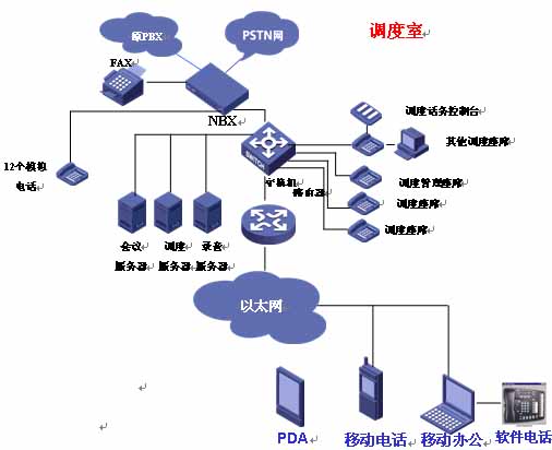 北京市交通應(yīng)急指揮中心,此次項目采用了1500個設(shè)備容量的華為3Com V3000 NBX系統(tǒng)一臺為核心語音調(diào)度交換機,連接PSTN網(wǎng)。使用3101標(biāo)準(zhǔn)版IP智能話機、3102商務(wù)版IP智能話機和3105話務(wù)臺總數(shù)量達到了34部。在已有的網(wǎng)絡(luò)結(jié)構(gòu)中實施語音系統(tǒng),減少對網(wǎng)絡(luò)基礎(chǔ)設(shè)施的投資,節(jié)省話路設(shè)備成本、電話系統(tǒng)安裝、維護和使用管理,還可提供更多的通信業(yè)務(wù)和更強的智能語音功能。結(jié)構(gòu)圖如下: