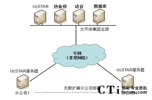 通過UcSTAR統(tǒng)一通信系統(tǒng)實現(xiàn)以公司總部為主的星型架構(gòu)的通信系統(tǒng)部署,實現(xiàn)集團(tuán)內(nèi)部的溝通與協(xié)作應(yīng)用。