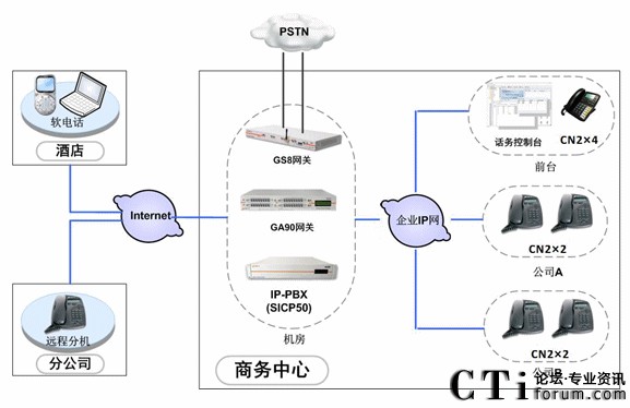 中天凱旋利用企業(yè)內(nèi)部完善的IP通信網(wǎng)絡(luò),在機(jī)房部署SICP系統(tǒng),負(fù)責(zé)整個(gè)語(yǔ)音通信系統(tǒng)的服務(wù)管理、用戶管理。部署GA90網(wǎng)關(guān)和GS8網(wǎng)關(guān),分別使用E1中繼線路和普通模擬線路接入PSTN網(wǎng)絡(luò),保證系統(tǒng)的通信。