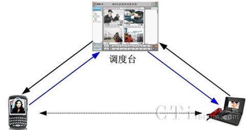 當(dāng)指揮人員需要讓兩個視頻設(shè)備實現(xiàn)點(diǎn)對點(diǎn)視頻通信時,如兩個終端是同一型號設(shè)備,可直接進(jìn)行視頻通信,如兩個不同型號的視頻設(shè)備需要進(jìn)行視頻通信,可由調(diào)度臺調(diào)度兩個視頻設(shè)備,然后通過視頻轉(zhuǎn)發(fā)功能實現(xiàn)兩個不同視頻設(shè)備的視頻通信。