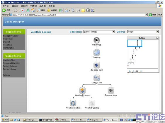 Home,在打開的Voxeo Prophecy網(wǎng)頁中點擊Prophecy Designer即開始了我們創(chuàng)建VoiceXML項目的輕松之旅。該設計工具將整個VoiceXML應用以圖表或樹狀結構直觀地呈現(xiàn)給開發(fā)者,可以方便地控制和修改其交互流程,如圖3所示。