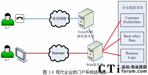 隨著Internet和Web技術(shù)的迅速發(fā)展,越來的企業(yè)開始建立自己的門戶網(wǎng)站,同時又擁有自己的IVR系統(tǒng)(如圖3.8所示),但是兩套系統(tǒng)完全獨(dú)立,語音系統(tǒng)和數(shù)據(jù)系統(tǒng)沒有任何交互或者只有很少的交互。而建立IVR系統(tǒng)的目標(biāo)就是給客戶更好的體驗(yàn),使客戶能方便的通過電話完成更多以前需要登陸企業(yè)門戶網(wǎng)站,或者親自去企業(yè)或其網(wǎng)點(diǎn)去辦理的業(yè)務(wù),這就需要IVR系統(tǒng)能跟后臺數(shù)據(jù)系統(tǒng)有更多更好的交互!罢Z音門戶”的概念出現(xiàn)也愈發(fā)的證明這一點(diǎn)。