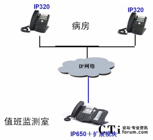 SoundPoint IP320。監(jiān)控室的值班醫(yī)生需要和患者溝通時,只需按IP650上病房相應(yīng)的快速撥號鍵,一鍵快速的呼叫病房的IP320。病房的患者也可以摘機或按免提鍵自動呼叫監(jiān)測室的IP650,和值班醫(yī)生進行溝通。當(dāng)值班醫(yī)生和患者通話時,其它患者的電話呼叫監(jiān)測室,值班醫(yī)生可以看到是哪個病房呼叫的,可以馬上接聽,也可以結(jié)束當(dāng)前通話后根據(jù)通話記錄回呼患者進行溝通。