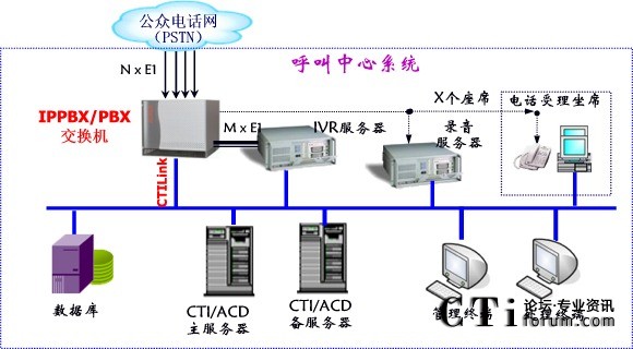 交換機方案主要由PBX/IPPBX交換機提供前段接入交換設備,后端計算機應用系統(tǒng)通過CTI Link與交換機交互和通信,并實現(xiàn)CTI控制;