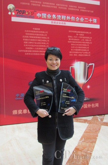 在2012中國服務(wù)外包領(lǐng)軍者年會的頒獎典禮上,第一線集團華北區(qū)總經(jīng)理陳施慧女士上臺領(lǐng)取了這兩個獎項。